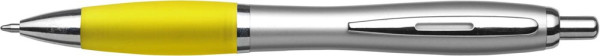 Zilverkleurige kunststof balpen, blauwschrijvend, met gekleurde rubberen grip en metalen clip.
