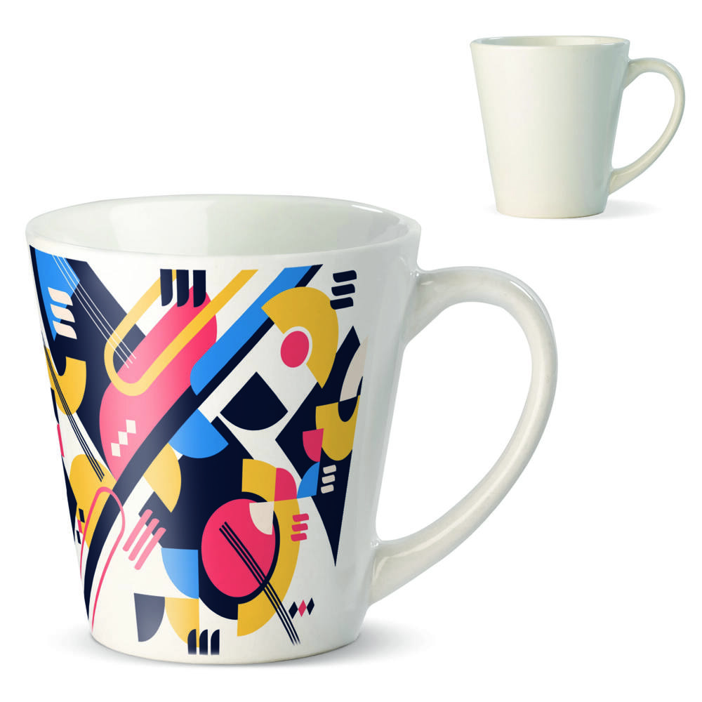 Conische aardewerk mok. Middels sublimatie druktechniek groot rondom en zelfs in fotokwaliteit te bedrukken.