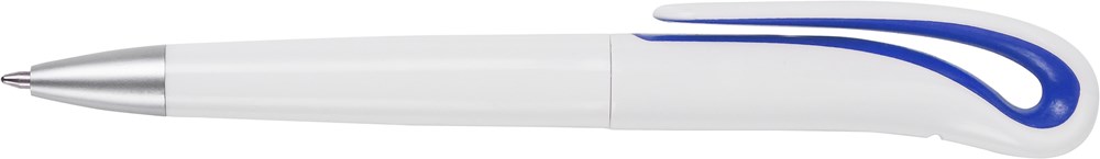 Kunststof balpen met gekleurde elementen, zwartschrijvend, met de clip in de vorm van een zwanenhals. Geregistreerd artikel.