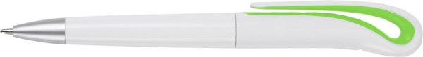 Kunststof balpen met gekleurde elementen, zwartschrijvend, met de clip in de vorm van een zwanenhals. Geregistreerd artikel.
