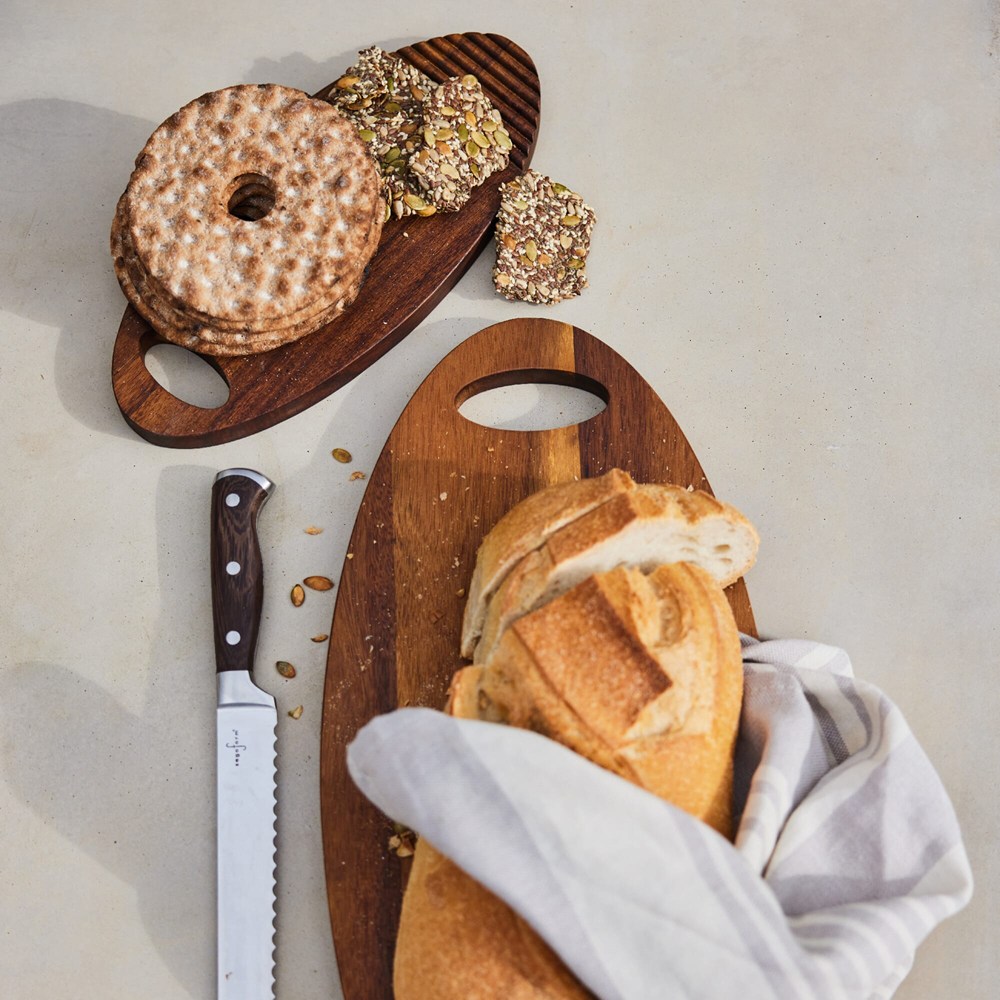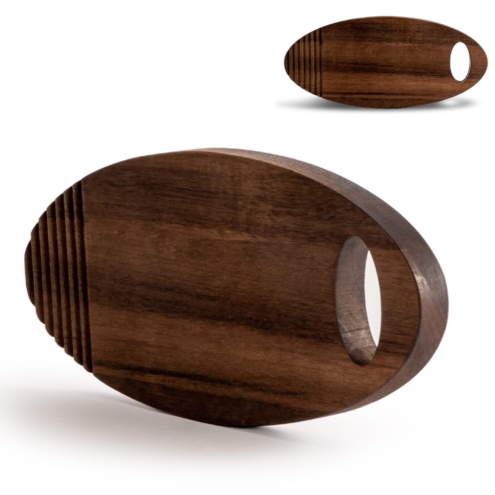 Deze kleine Ante snijplank heeft een opvallende vorm. Het ovaal gevormde model heeft uitgesneden strepen aan één uiteinde en is gemaakt van donker robuust (FSC) acaciahout. Ante is ook heel praktisch en mooi als hij op tafel staat. De snijplank is handgemaakt en heeft in vorm en kleur kleine verschillen, welke je alleen bij handgemaakte producten tegen komt. Het is goed om te weten dat houten snijplanken duurzamer zijn en ook vriendelijker voor messen.