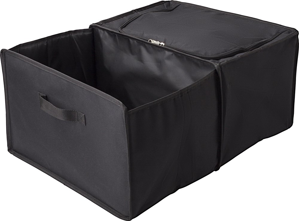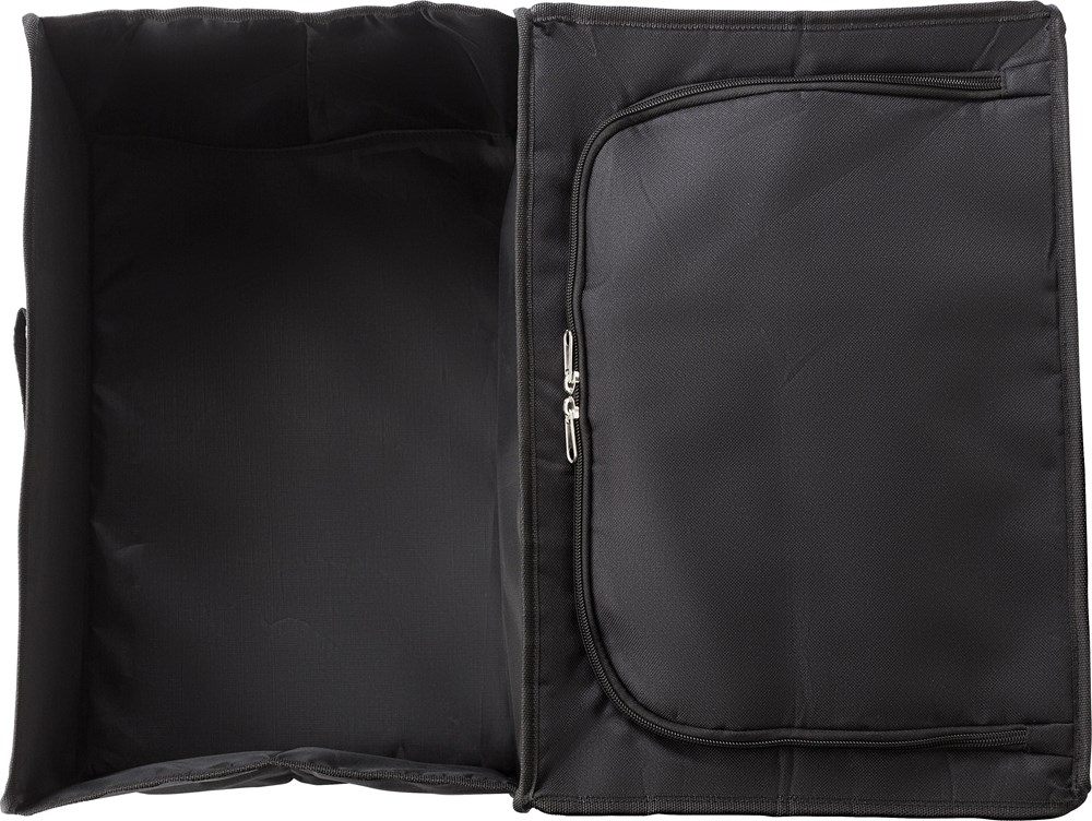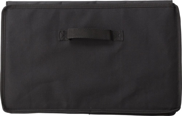 Polyester (600D) auto-organizer. Twee compartimenten, één koeltas met ritssluiting. Aluminium binnenkant aan de koeltaszijde. Opvouwbaar.