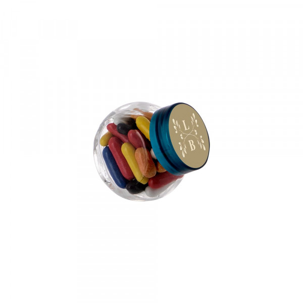 Micro glazen potje 50 ml met kobalt deksel, voorzien van een full colour sticker op het deksel en gevuld met Dropstaafjes mix
