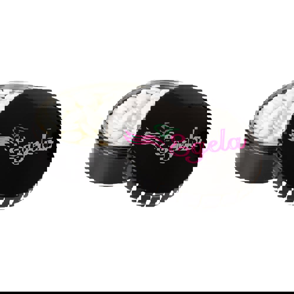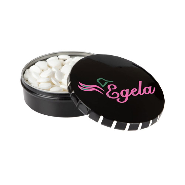 Clic-clac blikje zwart met ca. 50 gram suikervrije pepermunt voorzien van een full colour bedrukking. Inclusief ingrediëntensticker en seal