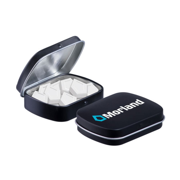 Mini scharnierblikje mat zwart met ca. 23 gram logo pepermunt voorzien van een full colour bedrukking. Inclusief ingrediëntensticker en seal.