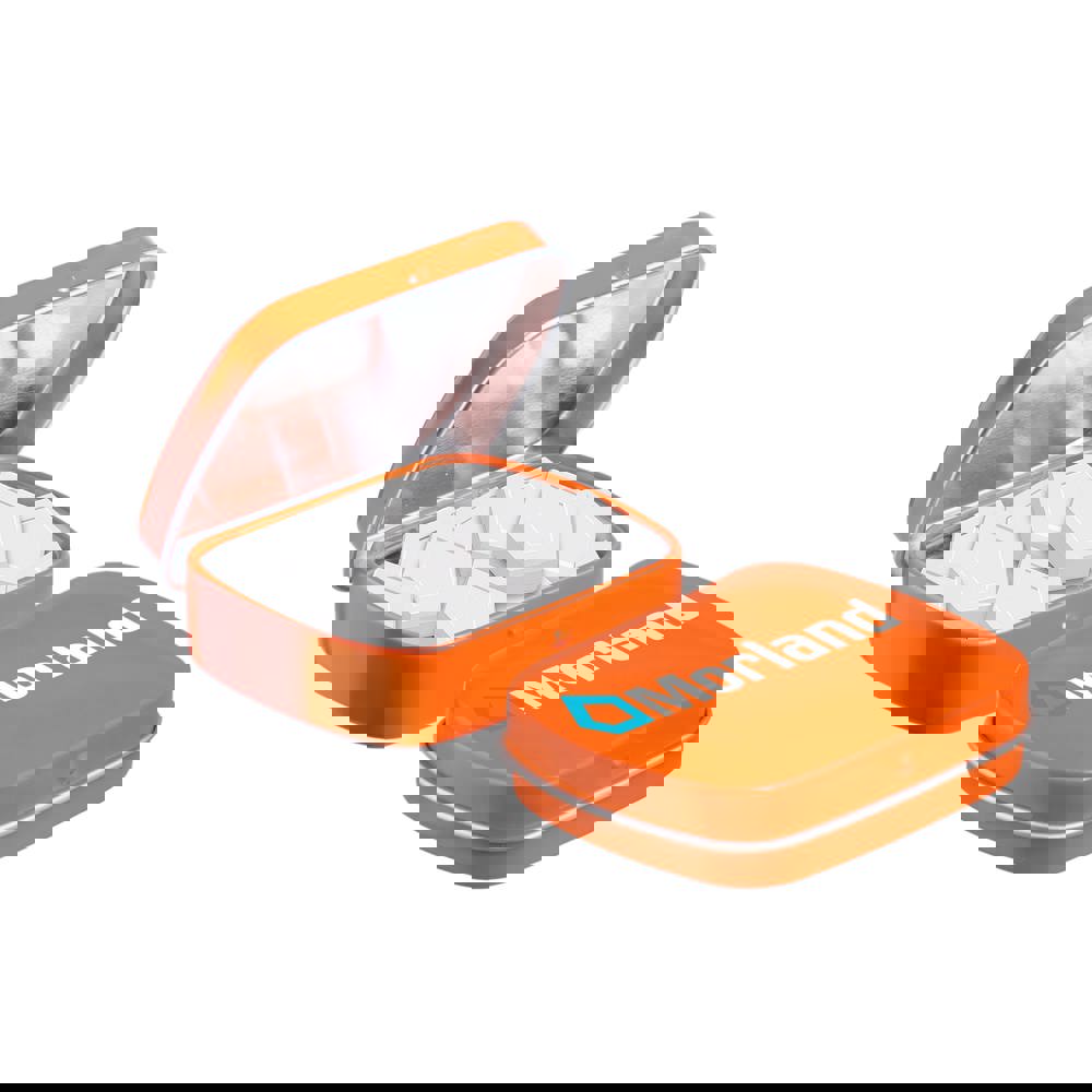 Mini scharnierblikje oranje met ca. 23 gram logo pepermunt voorzien van een full colour bedrukking. Inclusief ingrediëntensticker en seal.