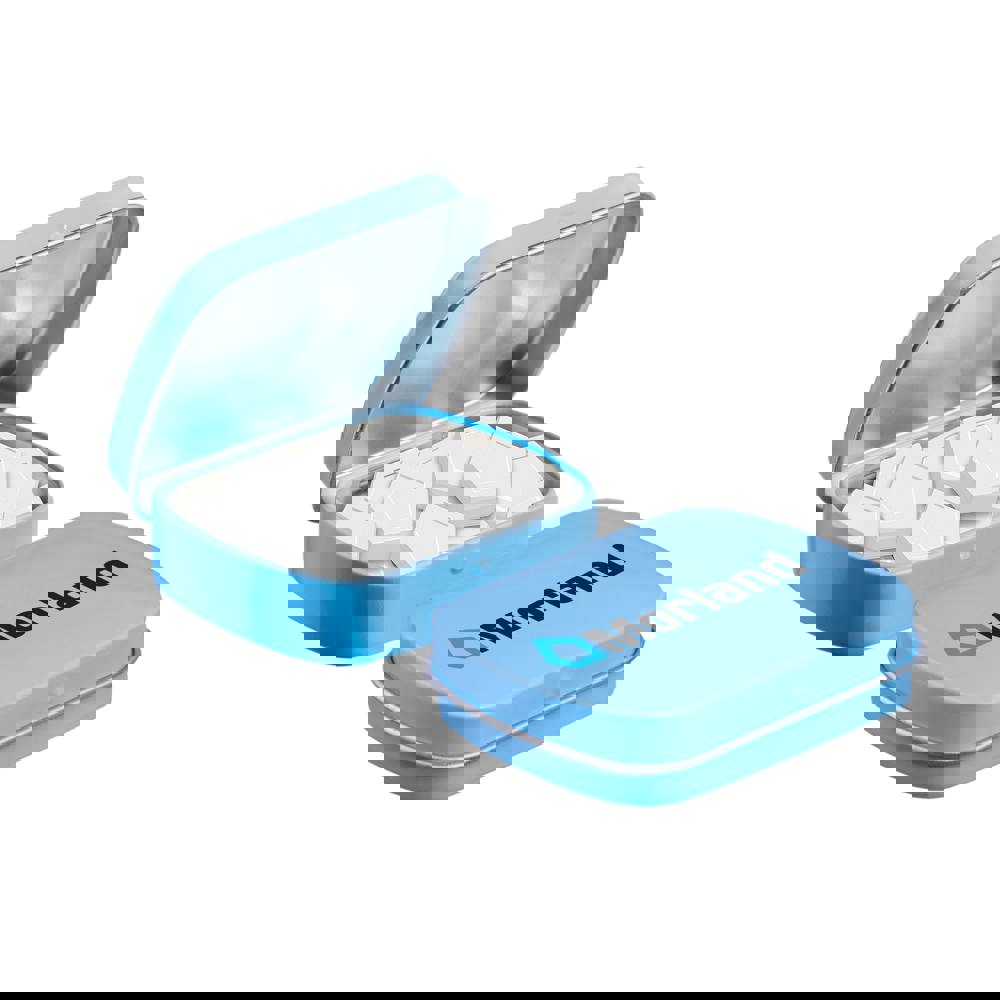 Mini scharnierblikje lichtblauw met ca. 23 gram logo pepermunt voorzien van een full colour bedrukking. Inclusief ingrediëntensticker en seal.