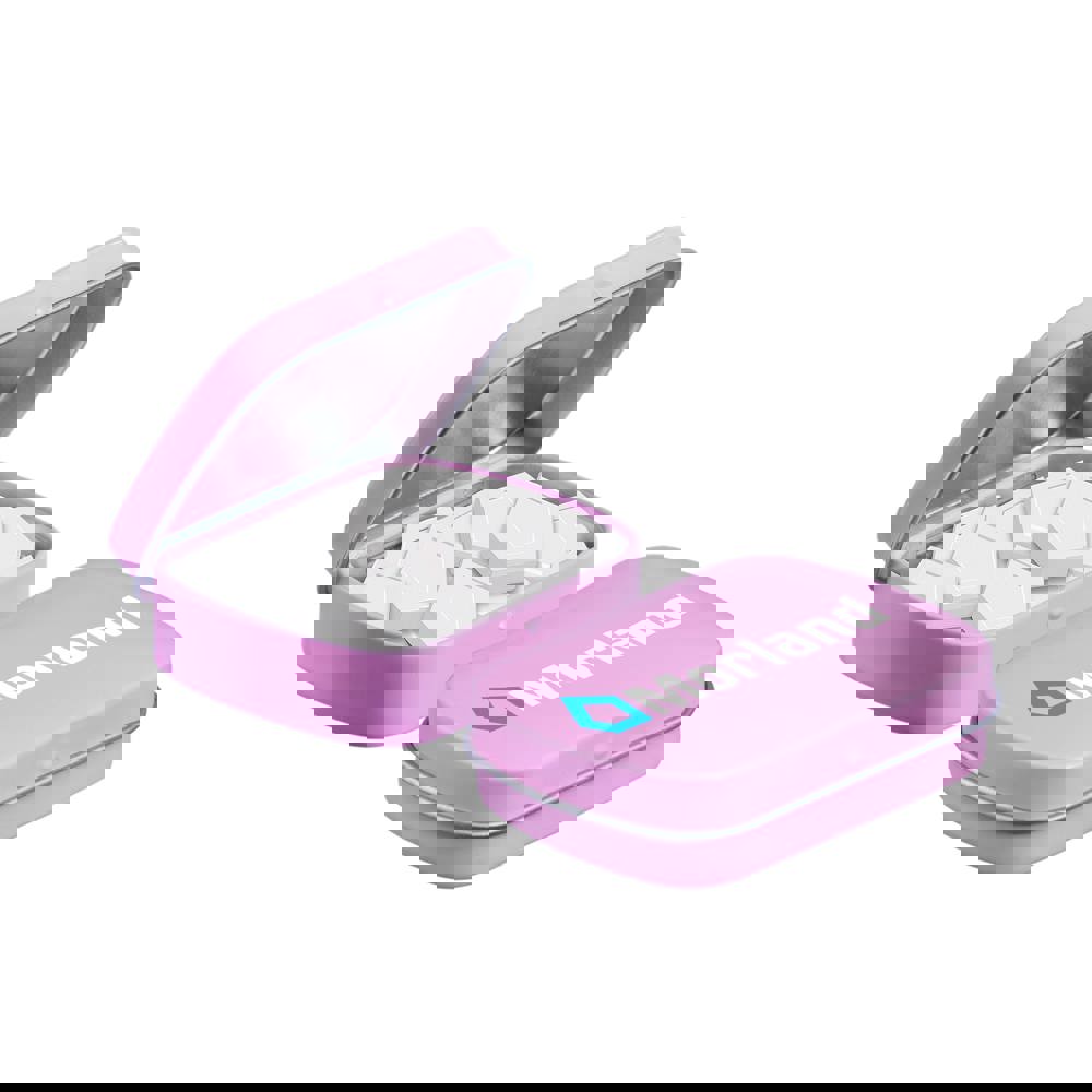 Mini scharnierblikje roze met ca. 23 gram logo pepermunt voorzien van een full colour bedrukking. Inclusief ingrediëntensticker en seal.