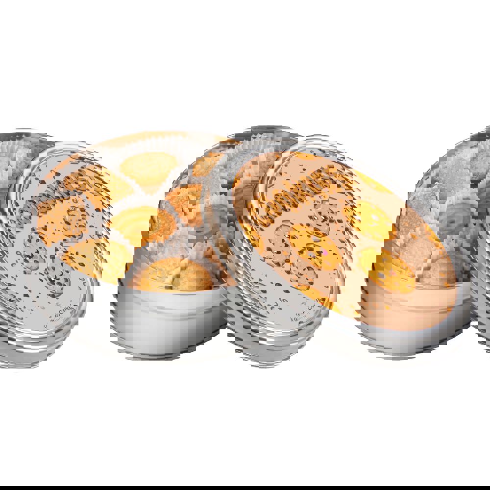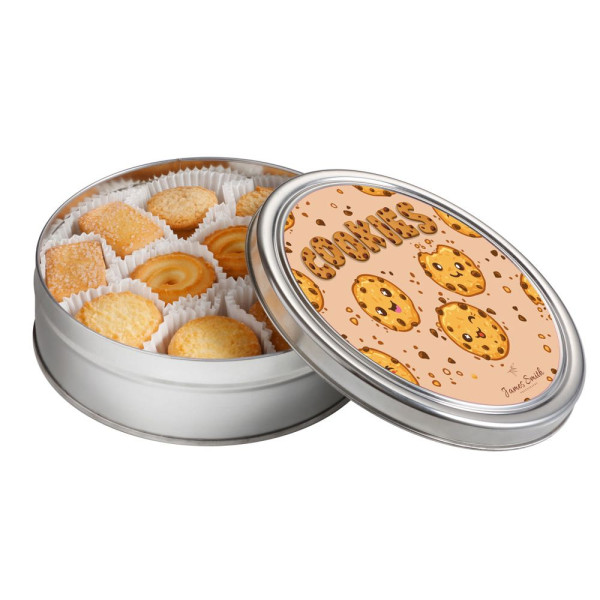 Plat rond blik gevuld met 40 assorti koekjes (ca. 340 gram), voorzien van een full colour sticker op het deksel