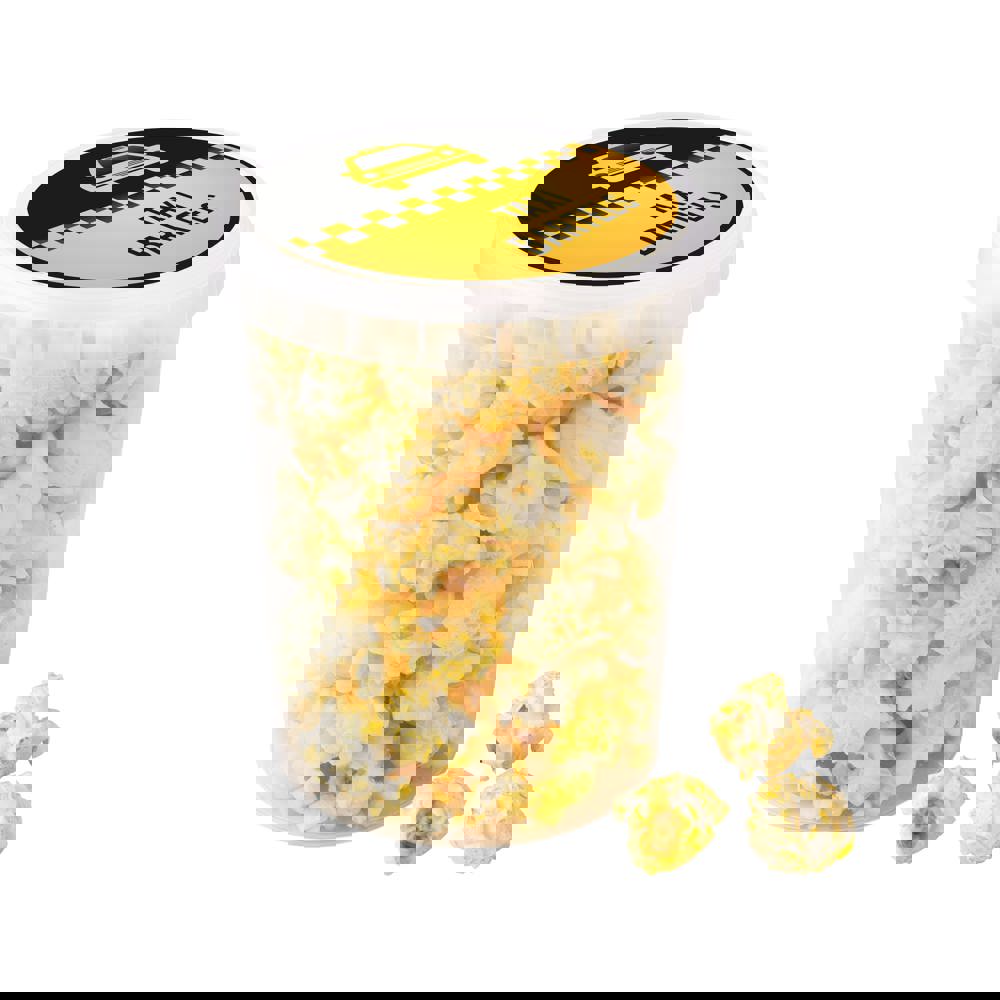 Transparant emmertje gevuld ca. 30 gr zoete popcorn of 18 gr zoute popcorn en voorzien van een full colour sticker op het deksel.