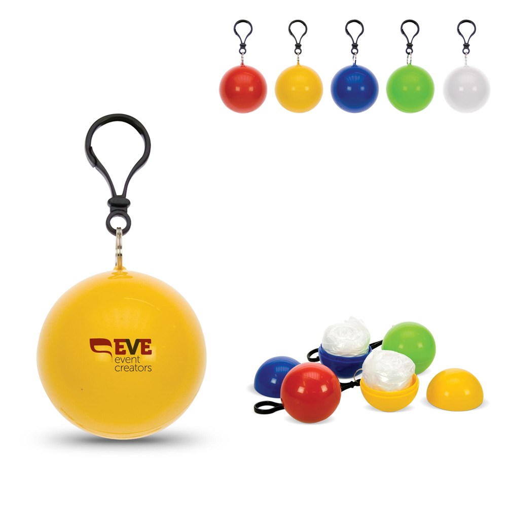 Regenponcho verpakt in bal. Altijd handig voor onderweg als het plotseling gaat regenen. Met karabijnhaak voor bevestiging aan bijvoorbeeld fiets of tas.