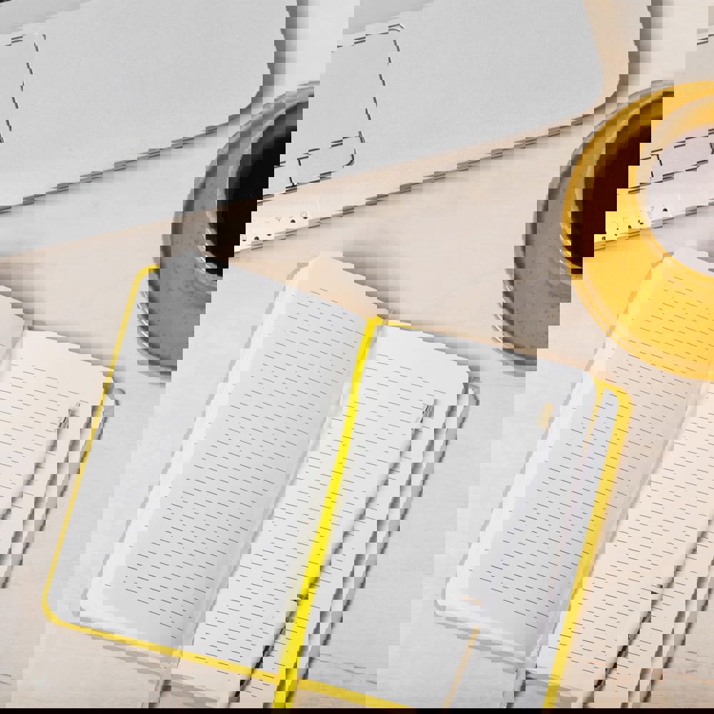 Klassiek ontworpen PU-notitieboek met bijpassende elastische band en lint. 96 vellen wit gelinieerd papier.