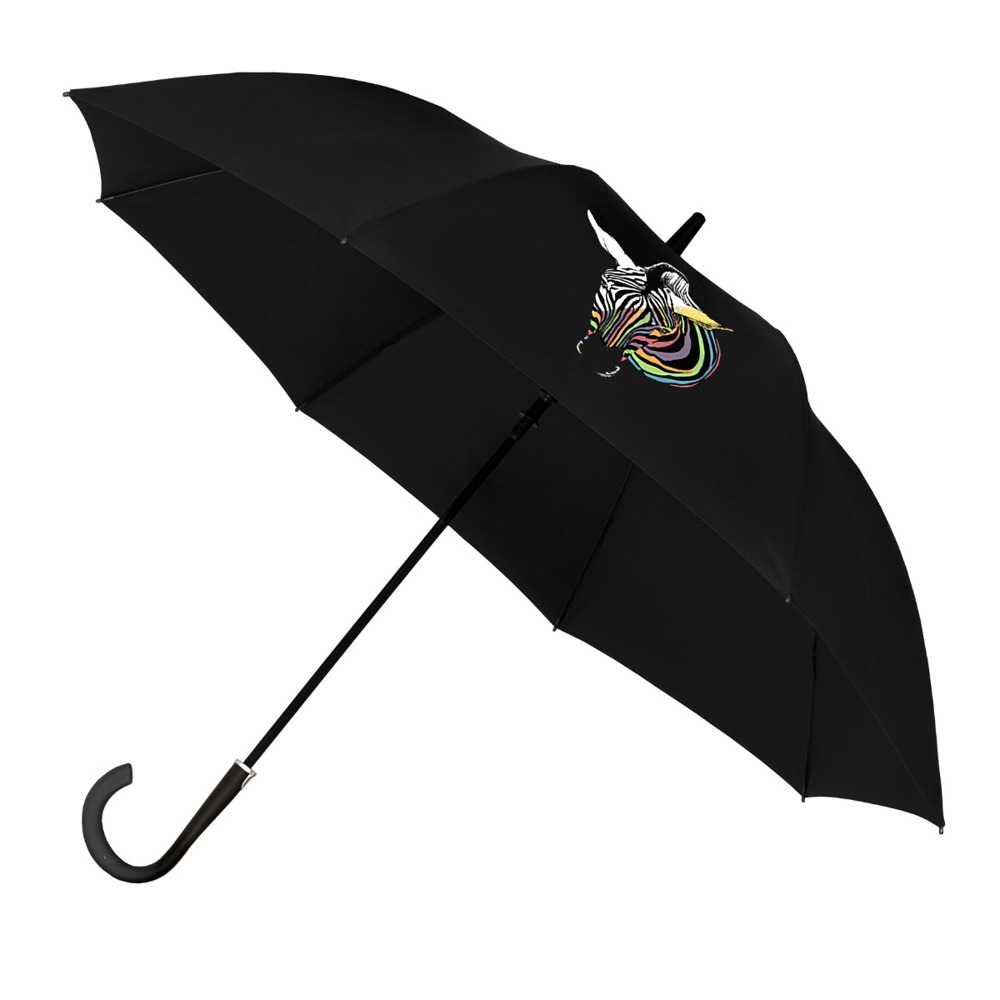 automaat, windproof, zwart metalen stok, glasfiber frame, polyester pongee doek, zwarte kunststof haak.