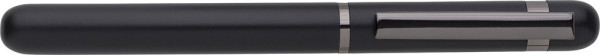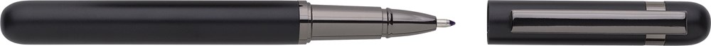 Aluminium en messing rollerbalpen. Met glanzende details op de clip, ring en drukknop. Blauwe...meer