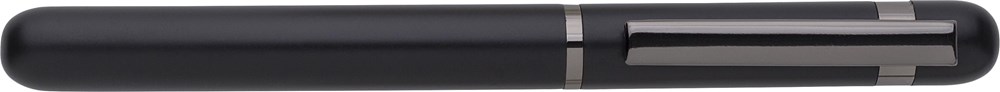 Aluminium en messing rollerbalpen. Met glanzende details op de clip, ring en drukknop. Blauwe inkt. Individueel verpakt in magnetische geschenkdoos met papieren hoes.