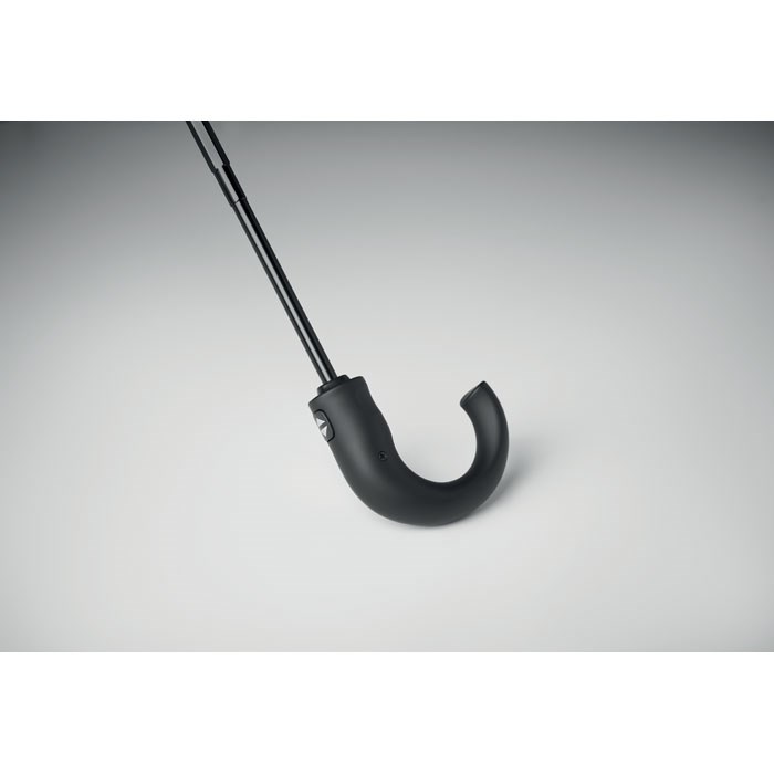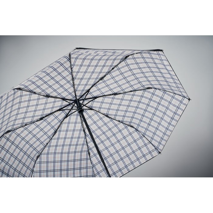 23 inch 3-voudige windbestendige auto open/close paraplu in dubbellaags 190T pongee met geruit binnenpatroon. Zwart geplastificeerd frame en schacht. Tweedelig zwart glasvezel vernikkeld middenstuk. Gebogen handvat van ABS met rubber.