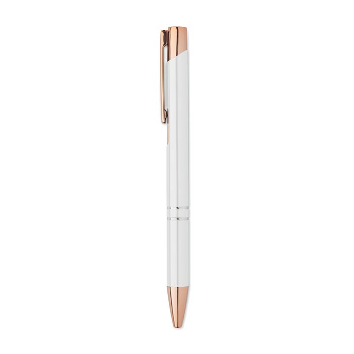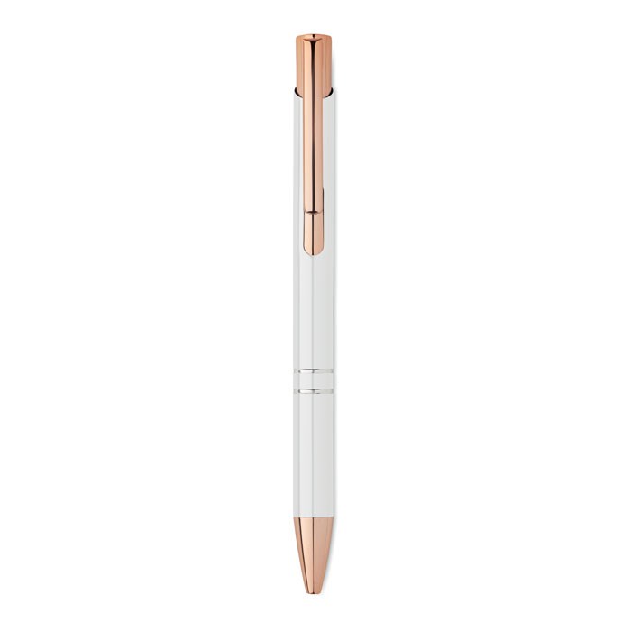 Pen met drukknop van gerecycled aluminium en roségouden details. Blauwe inkt.