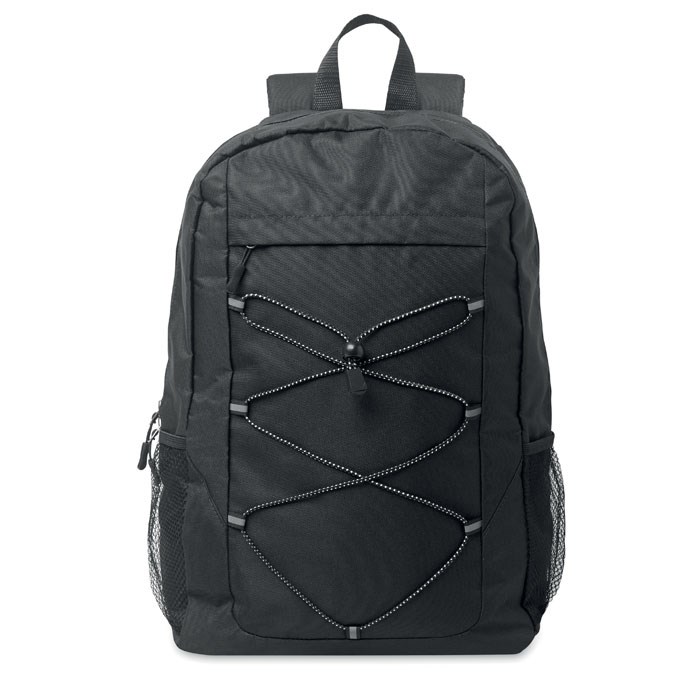 Rugzak van 600D RPET polyester met decoratief koord en ritsvak aan de voorkant. Meshzakken aan beide kanten.