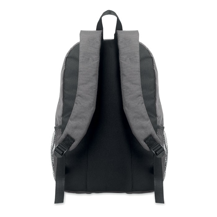 Rugzak van 600D RPET polyester met decoratief koord en ritsvak aan de voorkant. Meshzakken aan beide kanten.
