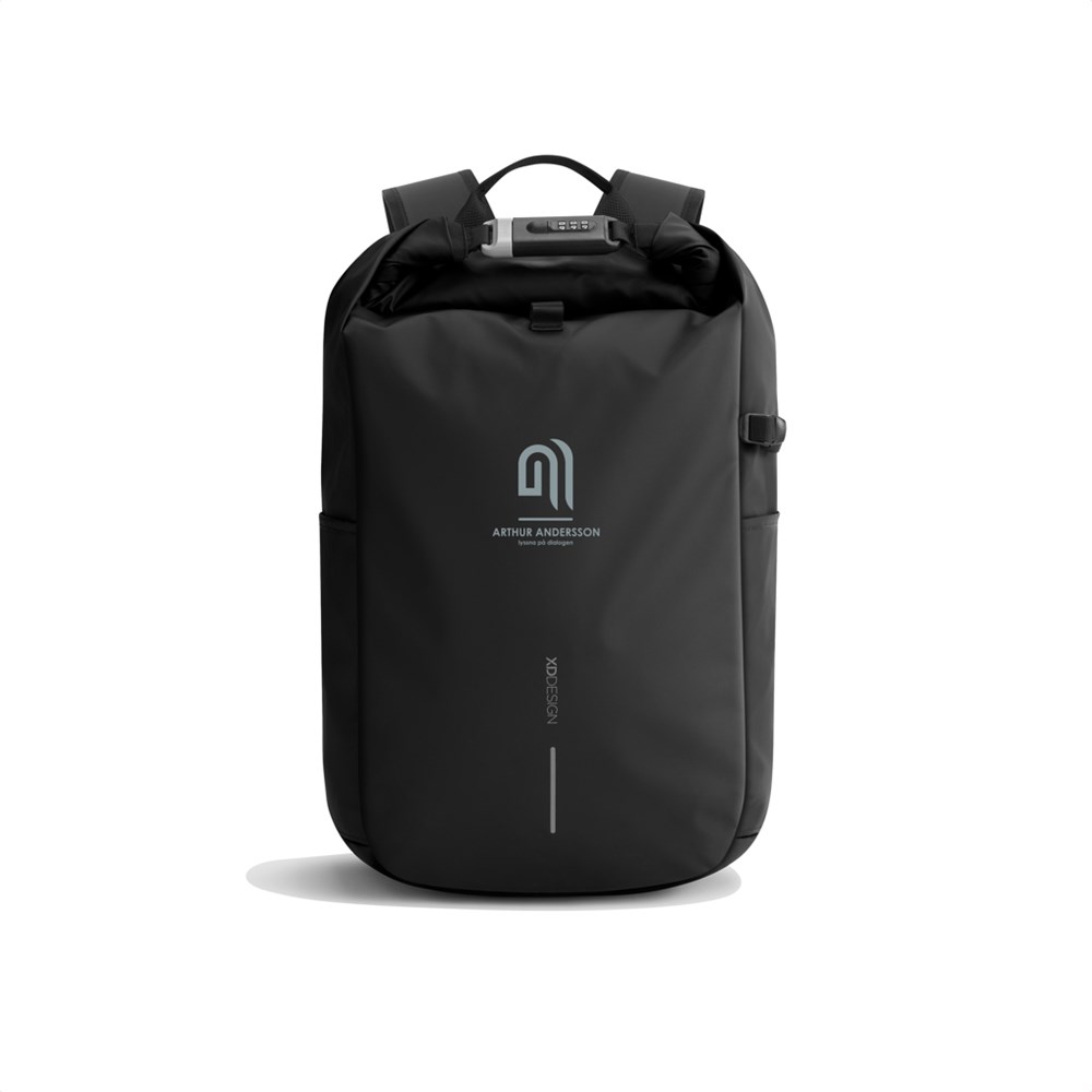 De nieuwe Urban anti-diefstal rugzak is de ideale reisgenoot, die veiligheid en gemak garandeert. Het hoofdvak wordt afgesloten door het op te rollen en vast te zetten met het versterkte combinatieslot, wat volledige afsluiting biedt en tevens gebruikt kan worden om de tas aan een vast object te vergrendelen. Verborgen vakken aan de achterkant. De tas is uitgerust met een zijvak voor een waterfles. Binnenin zorgen gewatteerde compartimenten voor een 16” laptop en gaasvakken bieden organisatie voor je benodigdheden. Gemaakt van Aware™ traceerbaar gerecycled polyester en afgewerkt met een zachte waterbestendige PU-coating. 11% gerecycled materiaal. Geregistreerd ontwerp®