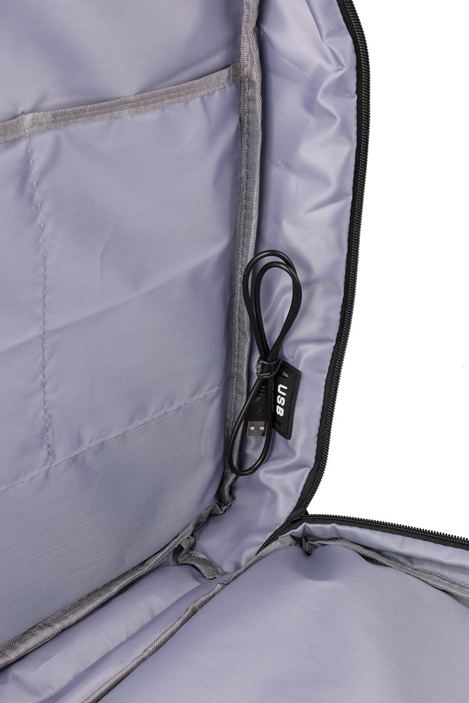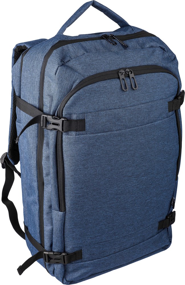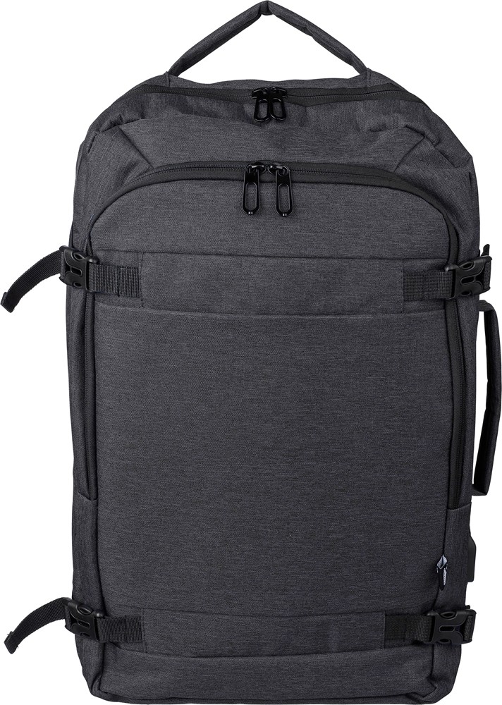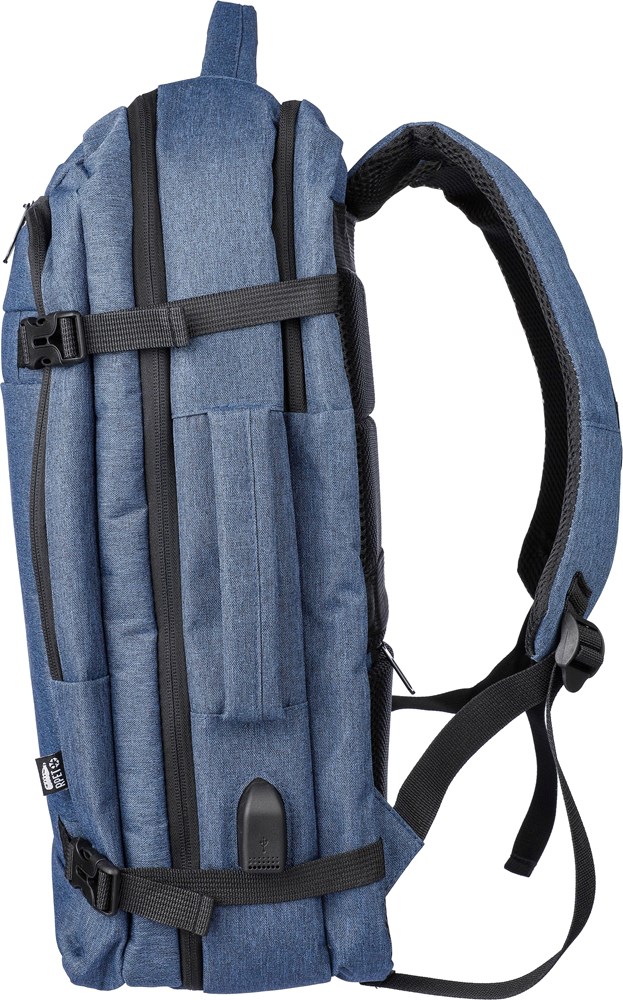 rPET polyester (300D) rugzak met 210D gevoerd laptopvak (17 inch) aan de binnenkant. Cabin-proof. Met draaglus aan de bovenkant en zijkanten. Laptopvak met klittenband, anti-diefstalvak en twee grote vakken met ritssluiting. Ventilerend gewatteerde rug, trolleyband, sluitgespen en USB-A poort aan de zijkant. Met zijgespen om de bagage compact te houden. Draaggewicht ca. 12 kg. Inclusief rPET-label.