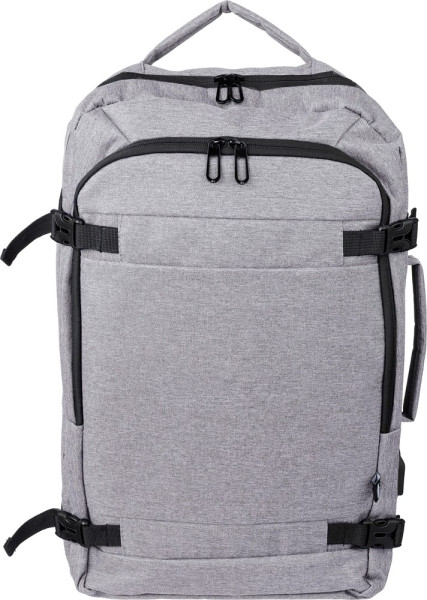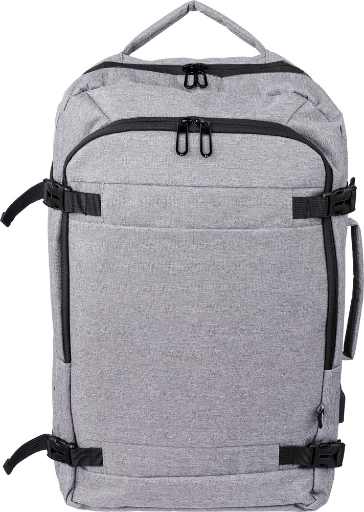 rPET polyester (300D) rugzak met 210D gevoerd laptopvak (17 inch) aan de binnenkant. Cabin-proof. Met draaglus aan de bovenkant en zijkanten. Laptopvak met klittenband, anti-diefstalvak en twee grote vakken met ritssluiting. Ventilerend gewatteerde rug, trolleyband, sluitgespen en USB-A poort aan de zijkant. Met zijgespen om de bagage compact te houden. Draaggewicht ca. 12 kg. Inclusief rPET-label.