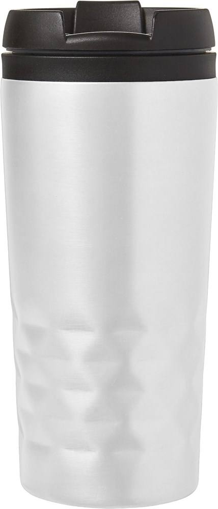 Roestvrijstalen reismok (300 ml) met zwarte deksel. Ook verkrijgbaar in gekleurd roestvrijstaal. De mok is dubbelwandig en de drinkopening heeft een klep.