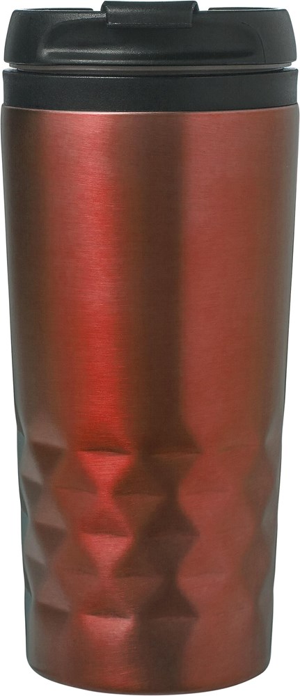 Roestvrijstalen reismok (300 ml) met zwarte deksel. Ook verkrijgbaar in gekleurd roestvrijstaal. De mok is dubbelwandig en de drinkopening heeft een klep.