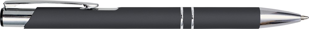 Metalen balpen, blauwschrijvend, met rubber en twee zilverkleurige ringen, clip en tip.