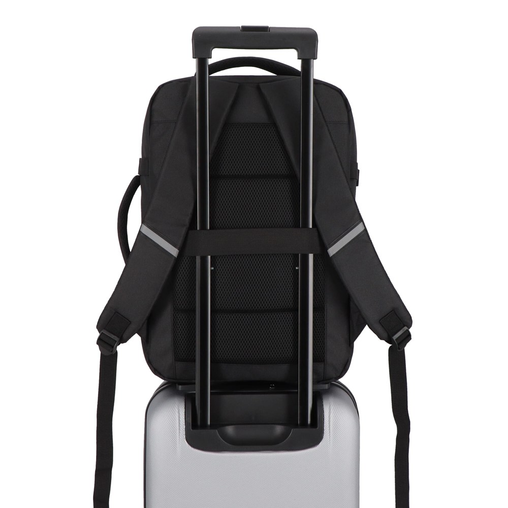 Deze rugzak is ontworpen met de moderne reiziger in gedachten. Hij opent 180 graden, met een verborgen vak voor kleding aan de ene kant en een gewatteerd laptopvak aan de andere kant. Het ruime voorvak biedt gemakkelijke toegang tot accessoires en benodigdheden. Voor comfort is de tas uitgerust met gevoerde handgrepen, verstelbare schouderbanden en een gewatteerd rugpaneel. Bovendien kun je de rugzak met een achterband veilig over het handvat van een trolleytas schuiven voor langere reizen. Reflecterende details verbeteren de zichtbaarheid en veiligheid als je 's nachts reist.