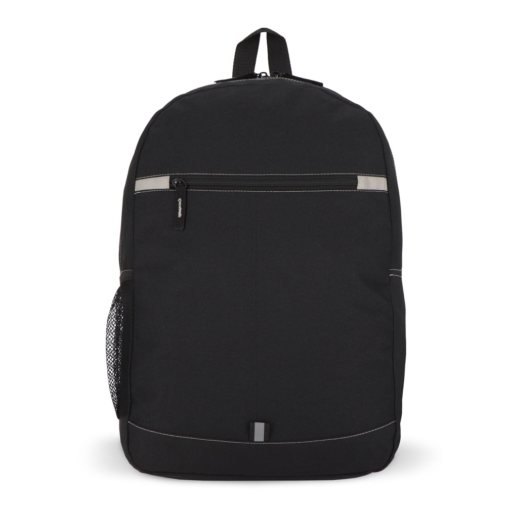 Deze rugzak is gemaakt van gerecycled PET. Hij heeft verstelbare gewatteerde schouderbanden, een handvat aan de bovenkant, een voorvak met ritssluiting, een zijvak van gaas en een kleine reflecterende strip voor zichtbaarheid 's nachts.