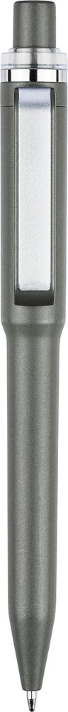 Gerecyclede ABS-balpen in de vorm van een reismok, met een metallic afwerking. Voorzien van blauwe vulling met een schrijfafstand van ongeveer 800 meter, drukmechanisme, kunststof drukknop, clip en verchroomde kunststof ring aan de bovenzijde. Inclusief in-mould gerecycled ABS-logo.