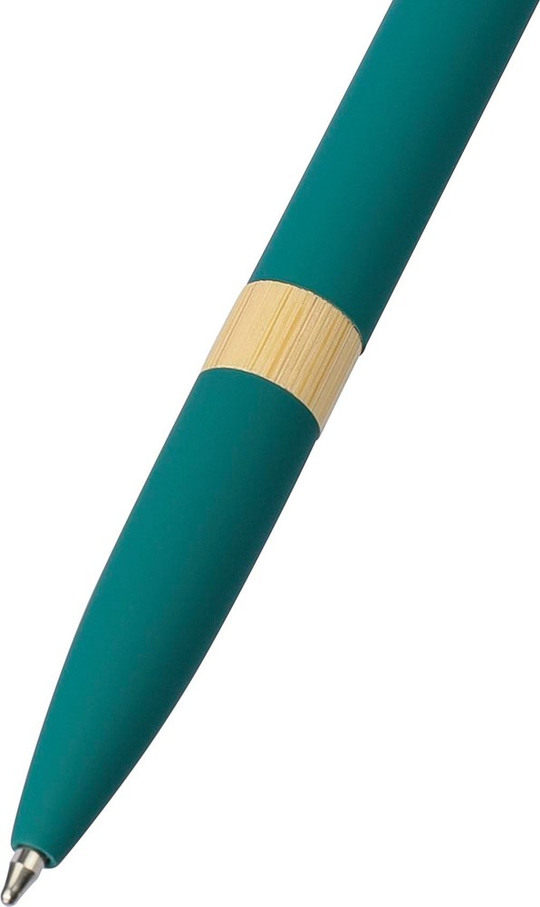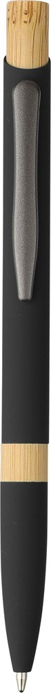 Gerecyclede aluminium balpen met een rubberen afwerking, bamboe drukknop en bamboe ring in de penhouder. Voorzien van een drukmechanisme, een 1,0 mm schrijfpunt en blauwe inkt met een schrijfafstand van ongeveer 800 meter. Inclusief een gegraveerd logo van gerecycled aluminium.