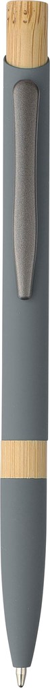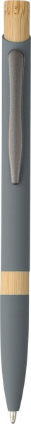 Gerecyclede aluminium balpen met een rubberen afwerking, bamboe drukknop en bamboe ring in de penhouder. Voorzien van een drukmechanisme, een 1,0 mm schrijfpunt en blauwe inkt met een schrijfafstand van ongeveer 800 meter. Inclusief een gegraveerd logo van gerecycled aluminium.