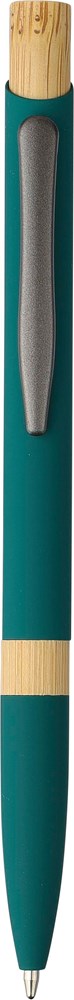 Gerecyclede aluminium balpen met een rubberen afwerking, bamboe drukknop en bamboe ring in de penhouder. Voorzien van een drukmechanisme, een 1,0 mm schrijfpunt en blauwe inkt met een schrijfafstand van ongeveer 800 meter. Inclusief een gegraveerd logo van gerecycled aluminium.