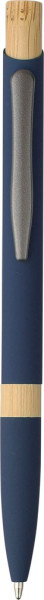 Gerecyclede aluminium balpen met een rubberen afwerking, bamboe drukknop en bamboe ring in de penhouder. Voorzien van een drukmechanisme, een 1,0 mm schrijfpunt en blauwe inkt met een schrijfafstand van ongeveer 800 meter. Inclusief een gegraveerd logo van gerecycled aluminium.