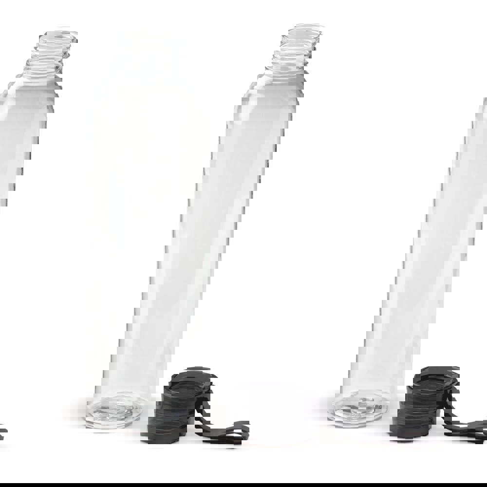 Enkelwandige drinkfles van Tritan materiaal met transparant gekleurde dop. Deze fles is uitgerust met een handige siliconen band zodat deze eenvoudig te dragen is of om bijvoorbeeld aan een tas te bevestigen. De fles is alleen geschikt voor koude, niet-koolzuurhoudende dranken en is BPA vrij. Geleverd in een geschenk verpakking.