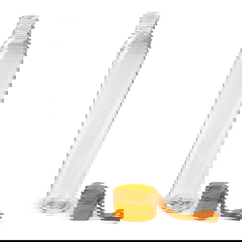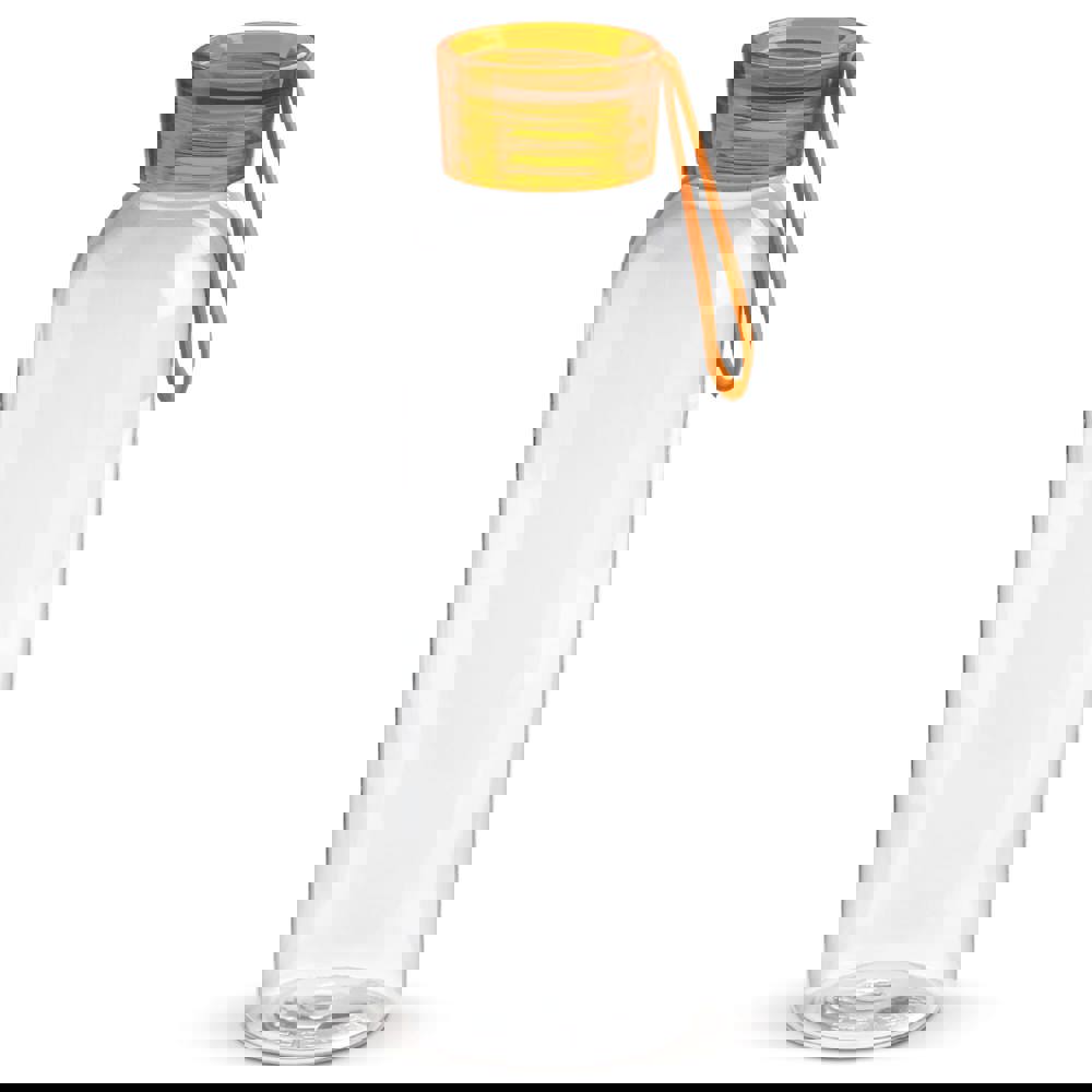 Enkelwandige drinkfles van Tritan materiaal met transparant gekleurde dop. Deze fles is uitgerust met een handige siliconen band zodat deze eenvoudig te dragen is of om bijvoorbeeld aan een tas te bevestigen. De fles is alleen geschikt voor koude, niet-koolzuurhoudende dranken en is BPA vrij. Geleverd in een geschenk verpakking.