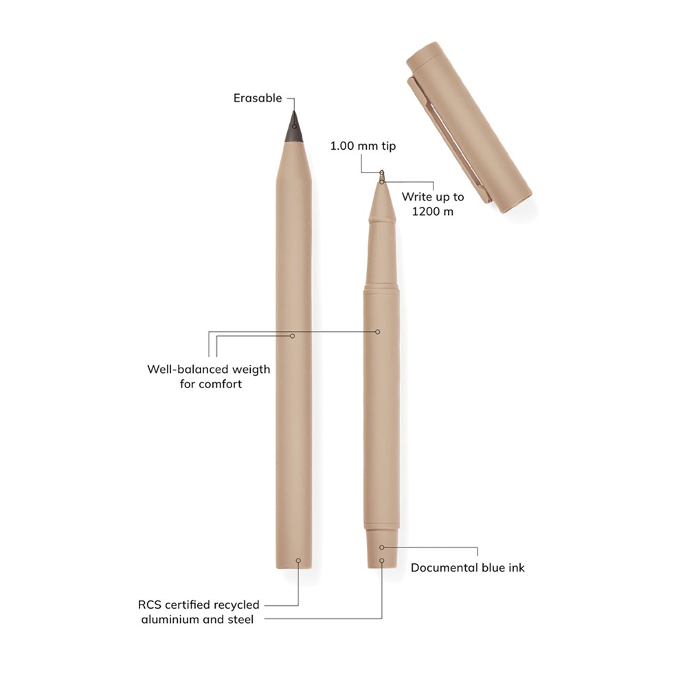 Deze moderne en stijlvolle set bestaat uit twee pennen: een eeuwigschrijvende pen en een klassieke balpen met dop en clip. Deze pennen zijn gemaakt van RCS gecertificeerd gerecycled roestvrij staal, met een rubberen coating voor een comfortabele grip en een matte afwerking. Beide pennen hebben een uitgebalanceerd gewicht dat zorgt voor stabiliteit en moeiteloos schrijven. Met de eeuwige pen kun je eindeloos schrijven. De balpen heeft een fijne punt van 1,00 mm en schrijft soepel en consistent met documental blauwe inkt, die tot 1200 meter meegaat. Gecertificeerd door RCS (Recycled Claim Standard), RCS-certificering garandeert de hele toeleveringsketen van gerecyclede materialen. De totale gerecyclede inhoud is gebaseerd op het totale productgewicht. Dit product bevat 52% RCS-gecertificeerd gerecycled aluminium en 10% RCS-gecertificeerd roestvrij staal.