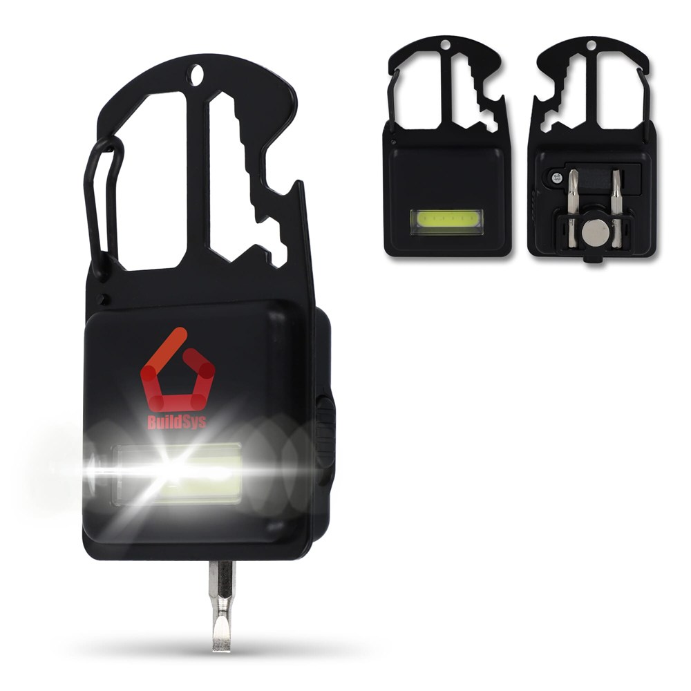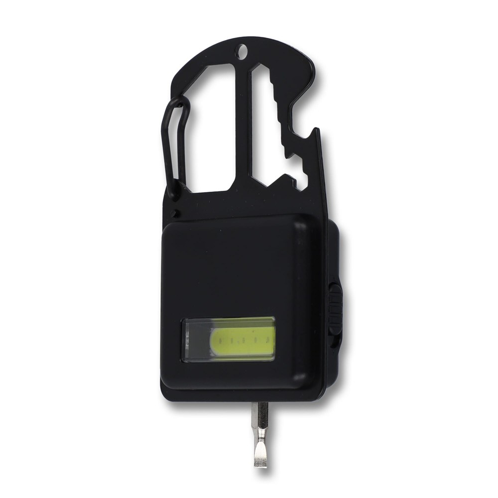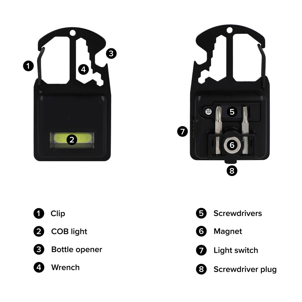Klem deze handige, multifunctionele tool in zakformaat aan je tas of riemlus, of gebruik de magneet om hem aan elk stalen oppervlak te bevestigen voor handsfree gebruik van de lamp. Deze tool heeft vijf extra functies: flesopener, moersleutel, COB-lamp, sterpuntschroevendraaier en platte schroevendraaier.