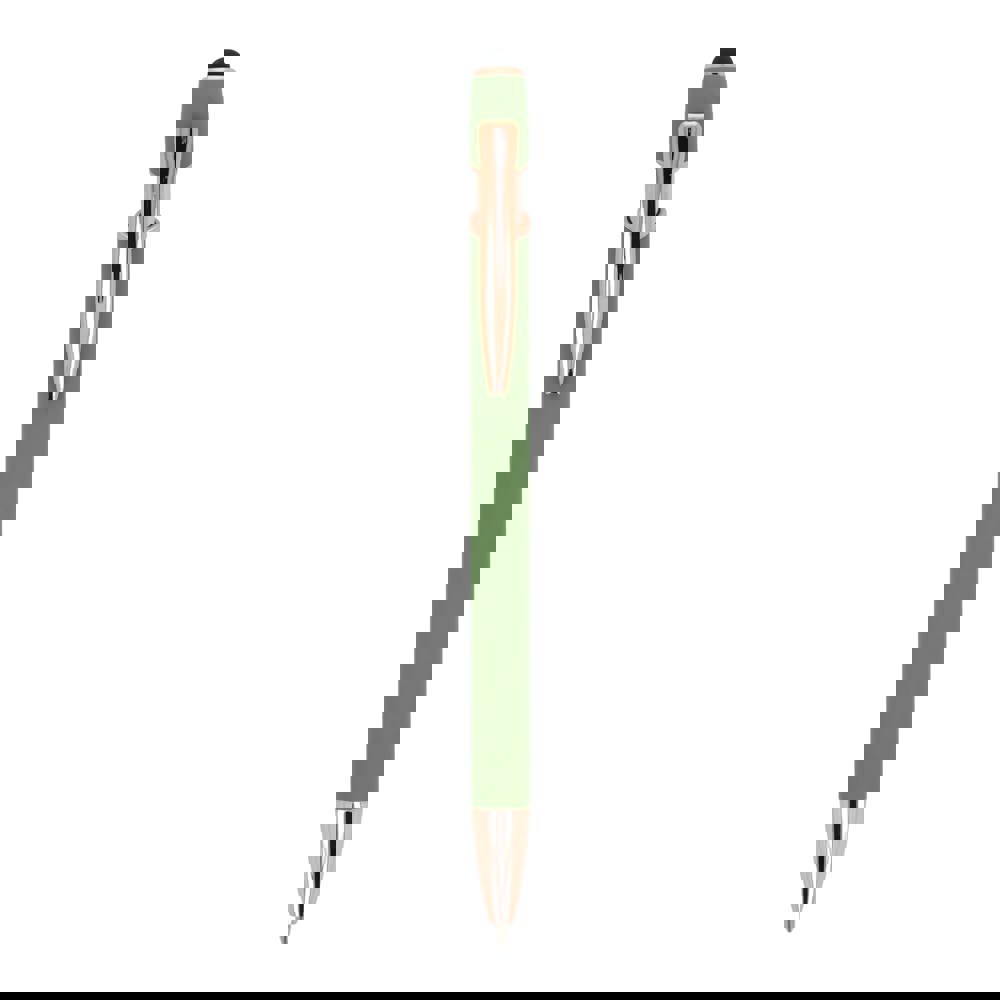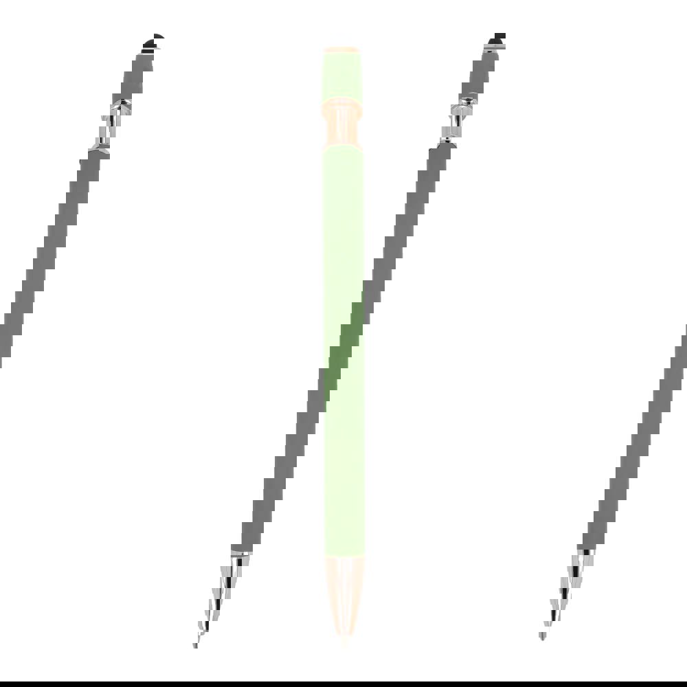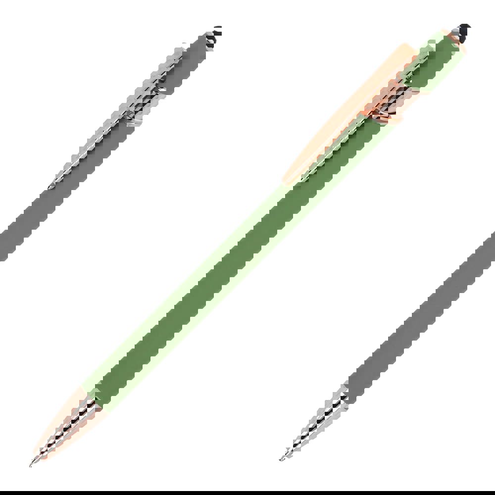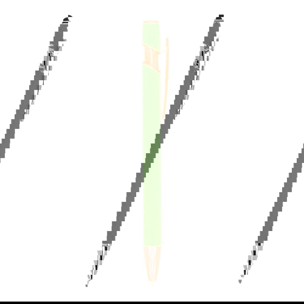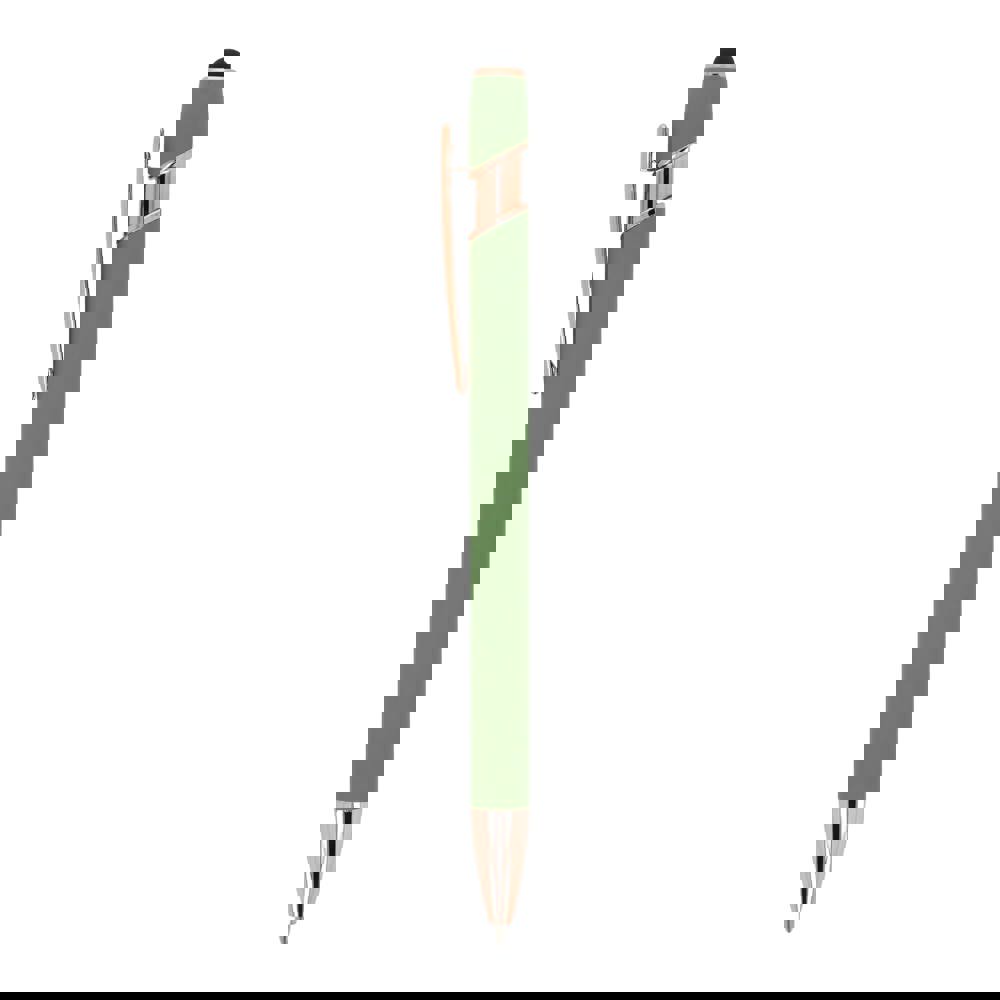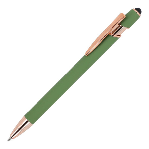 Rose Gold aluminium balpen met elegante soft-touch afwerking en stylus. Met een solide metalen clip. Schrijfkleur: blauw.