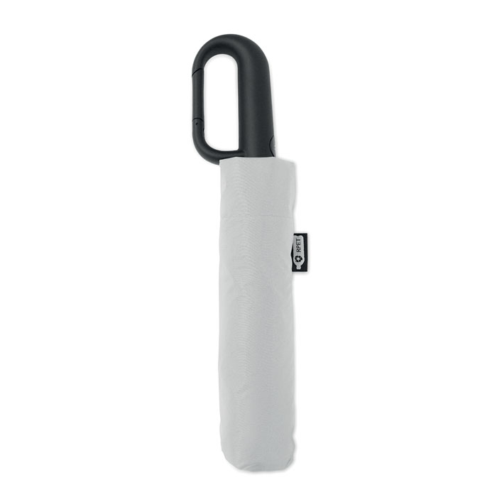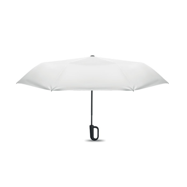 Opvouwbare 21'' windproof paraplu met volledig zwart geplatteerd fiberglas frame met 2 secties. Glasvezel baleinen. 190T RPET pongee panelen. D-vormig karabijnhaakhandvat met rubberen afwerking. Automatisch openen en sluiten. Inclusief etui