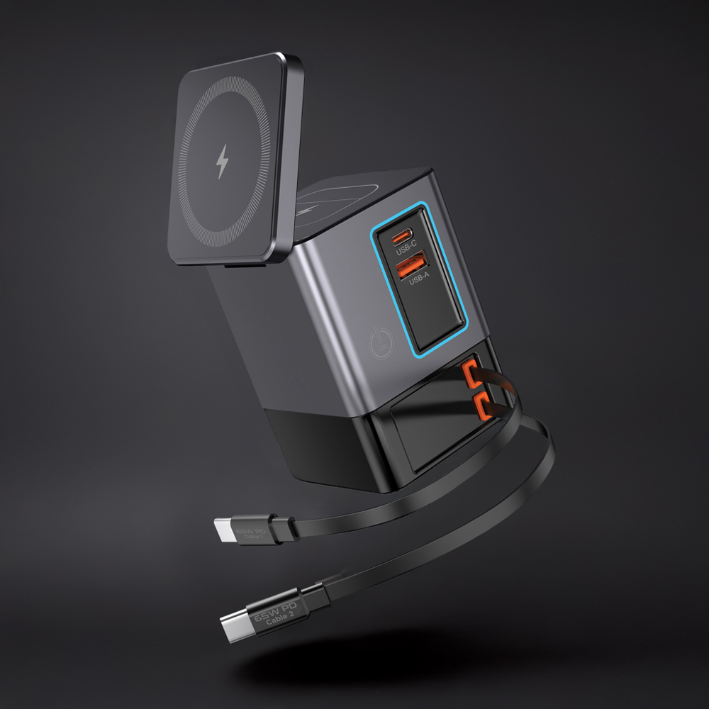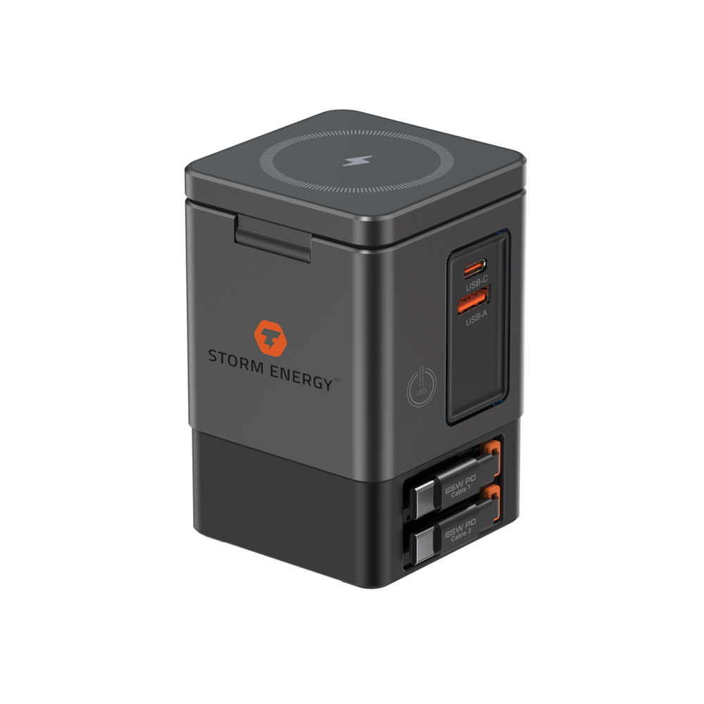 De alles-in-één stroomoplossing waar je op hebt gewacht. Sacramento is een 105W GaN-laadstation dat maximaal vermogen combineert met ingebouwd gemak. Het beschikt over twee geïntegreerde, intrekbare 65W USB-C-kabels, zodat je altijd snel kunt opladen – geen extra kabels nodig. Meer opties nodig? Sacramento heeft ook een USB-A- en USB-C-poort, waardoor je in totaal vier uitvoeropties hebt om laptops, tablets, smartphones en meer tegelijk op te laden. En voor je draadloze apparaten is Sacramento uitgerust met een krachtige 15W magnetische draadloze oplader die je telefoon stevig op zijn plaats houdt, plus een aparte draadloze pad die speciaal is ontworpen voor kleinere items zoals oordopjes of AirPods (maximaal 5W). Sacramento levert hoge prestaties met een compact, efficiënt ontwerp – produceert minder warmte en gebruikt energie efficiënter dan traditionele opladers. Sacramento is gemaakt met RCS (Recycled Claim Standard) gecertificeerd gerecycled brandwerend pc 26%.