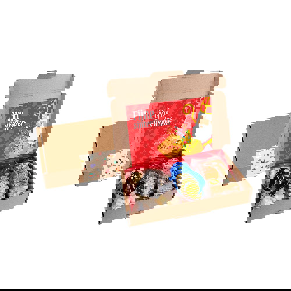 Bruin verzenddoosje A6 gevuld met een zakje Schuimpjes, een Oat King Spekulatius reep en...meer