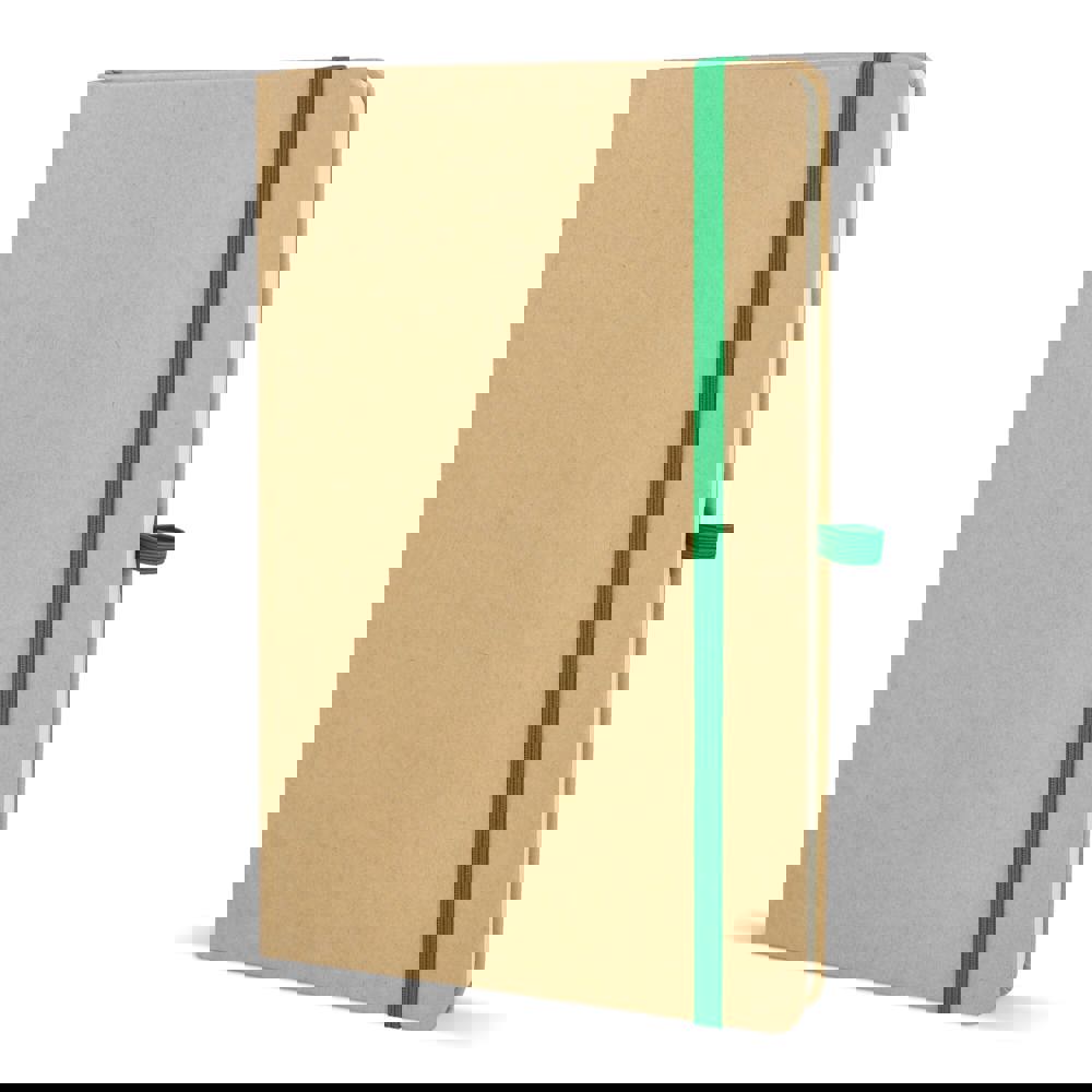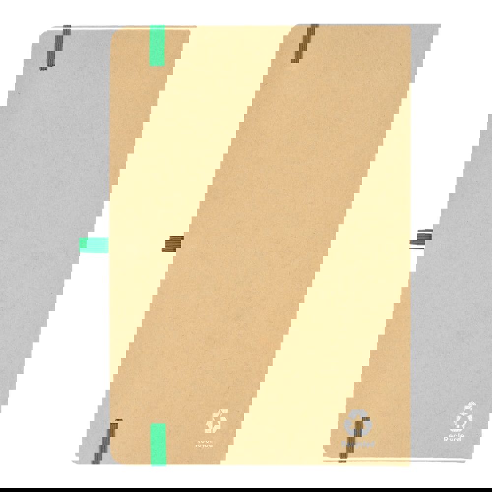 A5-notitieboek met kartonnen omslag, afgeronde hoeken, gekleurde elastische sluiting, leeslint en pennenlus. Bevat 80 gelinieerde crèmekleurige pagina’s van gerecycled papier. Een praktische en milieubewuste keuze voor dagelijks gebruik.
