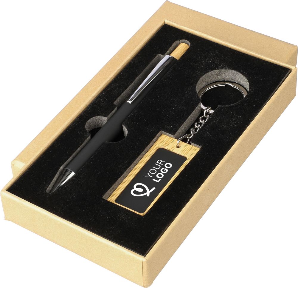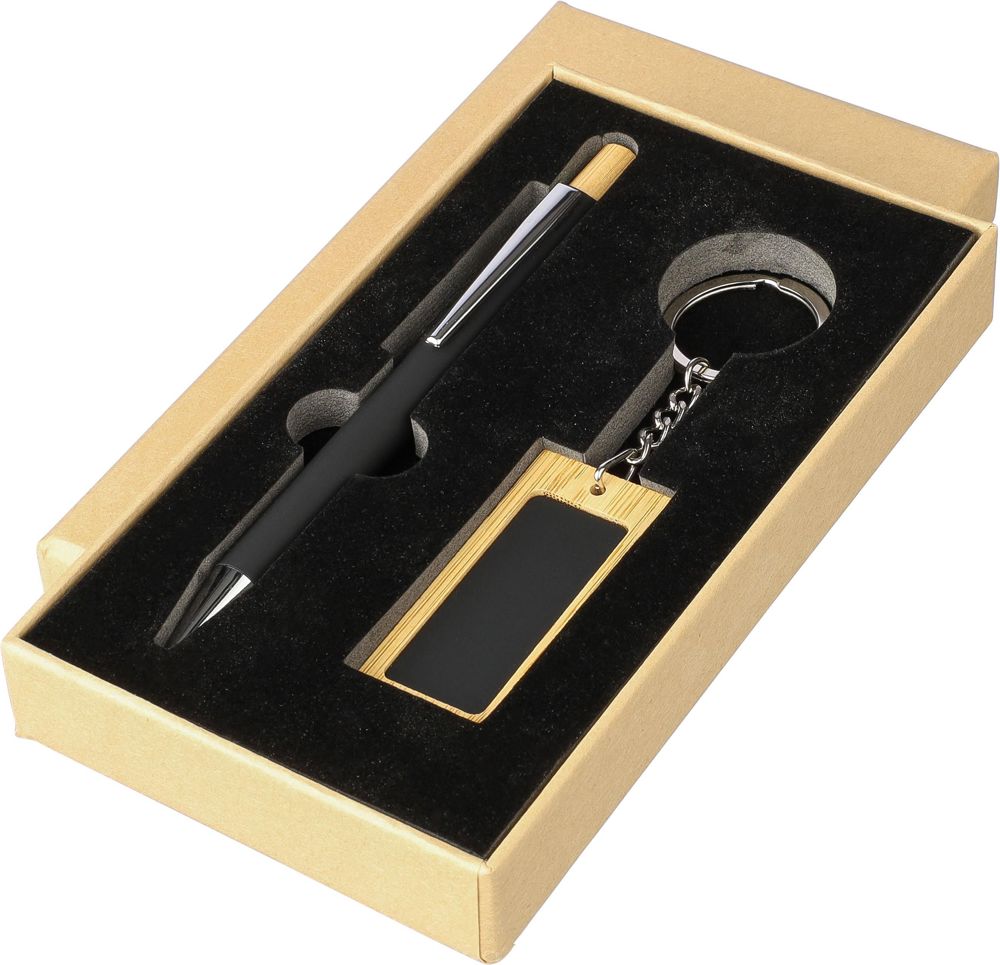 Bamboe schrijversset bestaande uit een bamboe en rubbercoating gerecyclede aluminium balpen met blauwe inkt, bamboe drukknop en verchroomde kunststof punt. Met een bamboe en rubbercoating roestvrijstalen rechthoekige sleutelhanger. Beide items hebben een spiegeleffect na lasergravure en zijn voorzien van een gerecycled aluminiumlogo. Verpakt in een kraftpapieren doos met fluwelen inlay.