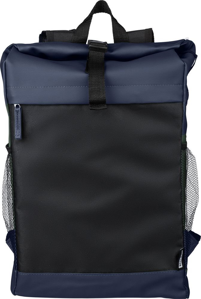 rPET (600D) polyester rolsluiting rugzak met waterafstotende PU-coating. Voorzien van een verborgen voorvak met ritssluiting, gevoerd laptopvak (geschikt voor laptops t/m 15 inch), mesh zijvakken en in totaal vijf compartimenten, inclusief binnen- en voorvakken. Ontworpen met verstelbare schouderbanden en een oprolbare sluiting met klittenband. Capaciteit: 25 liter, draagvermogen: 15 kg. Inclusief een rPET-label aan de zijkant.