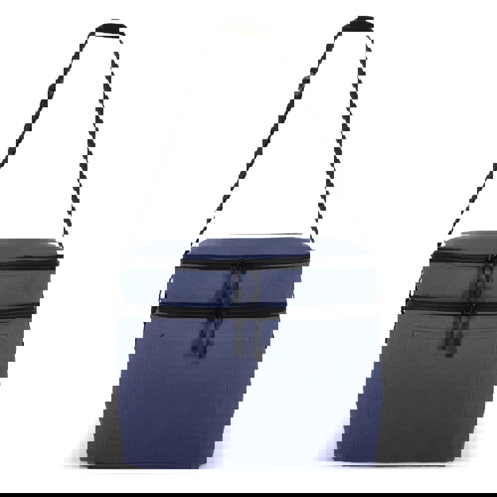 Koeltas van 600D gerecycled PET met een inhoud van 15L, voorzien van een groter ondervak en een kleiner bovenvak. Dankzij de isolerende PEVA-voering kun je warme en koude spullen gescheiden bewaren. De verstelbare schouderriem zorgt voor comfortabel dragen, ideaal voor onderweg.