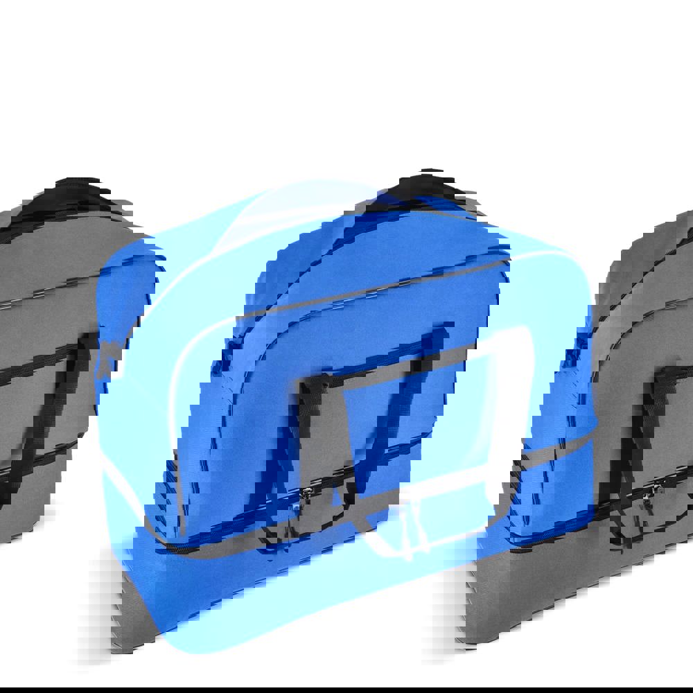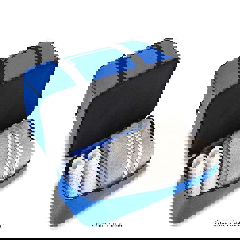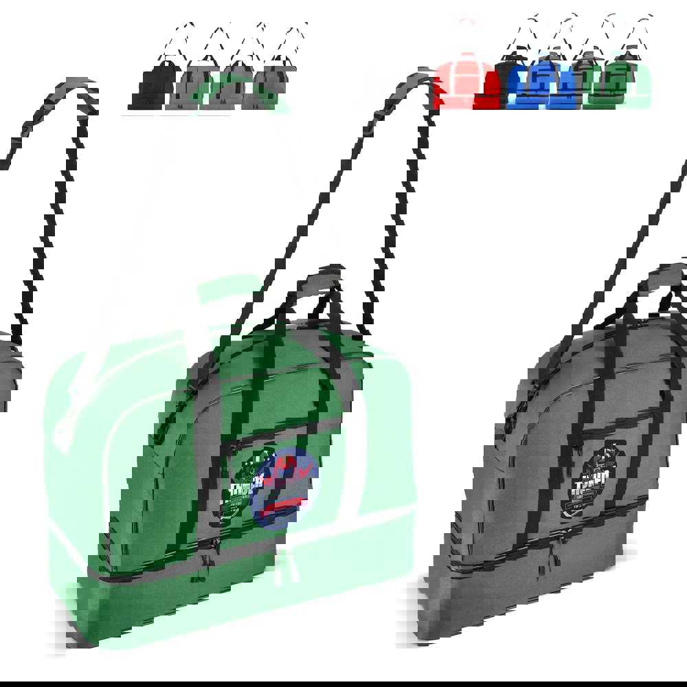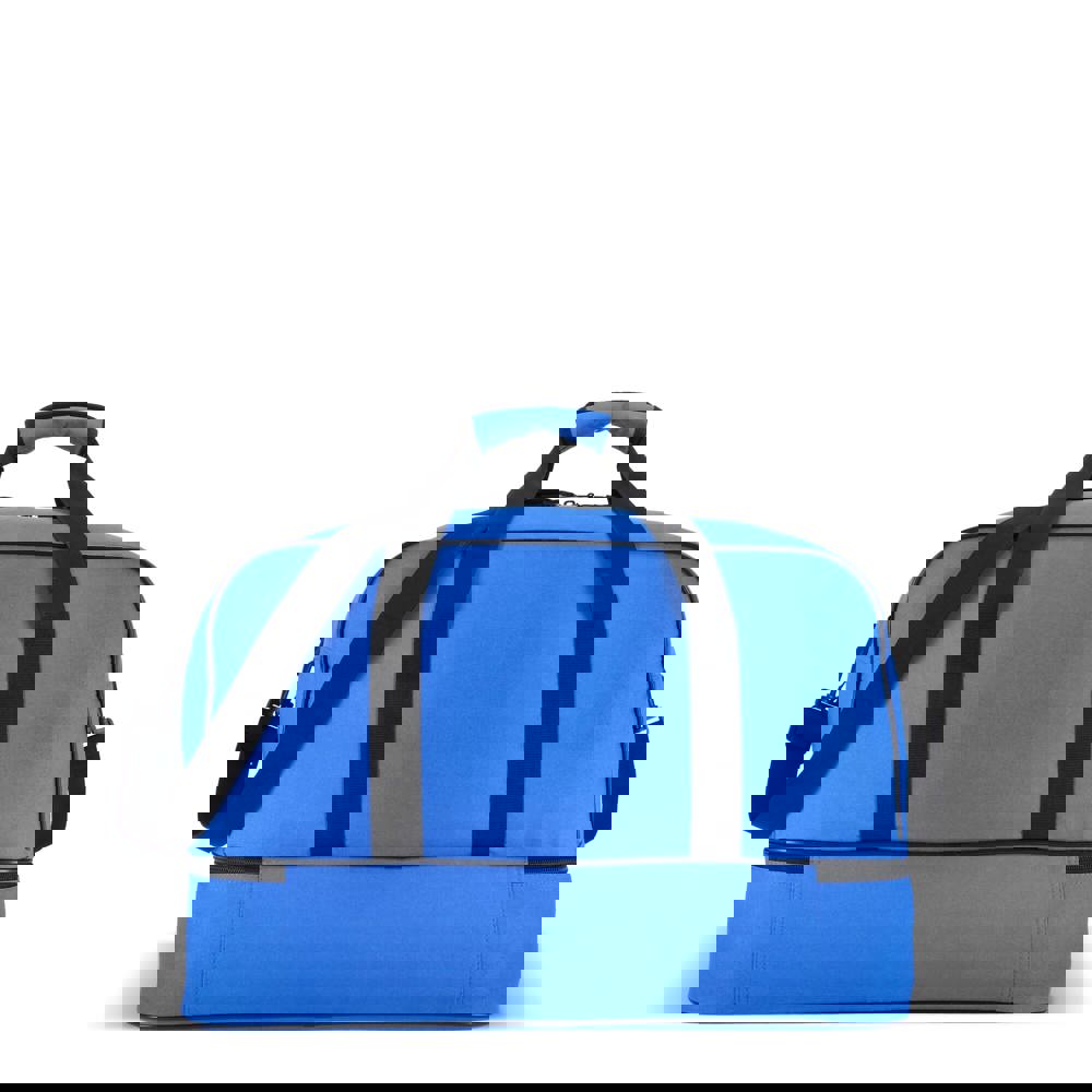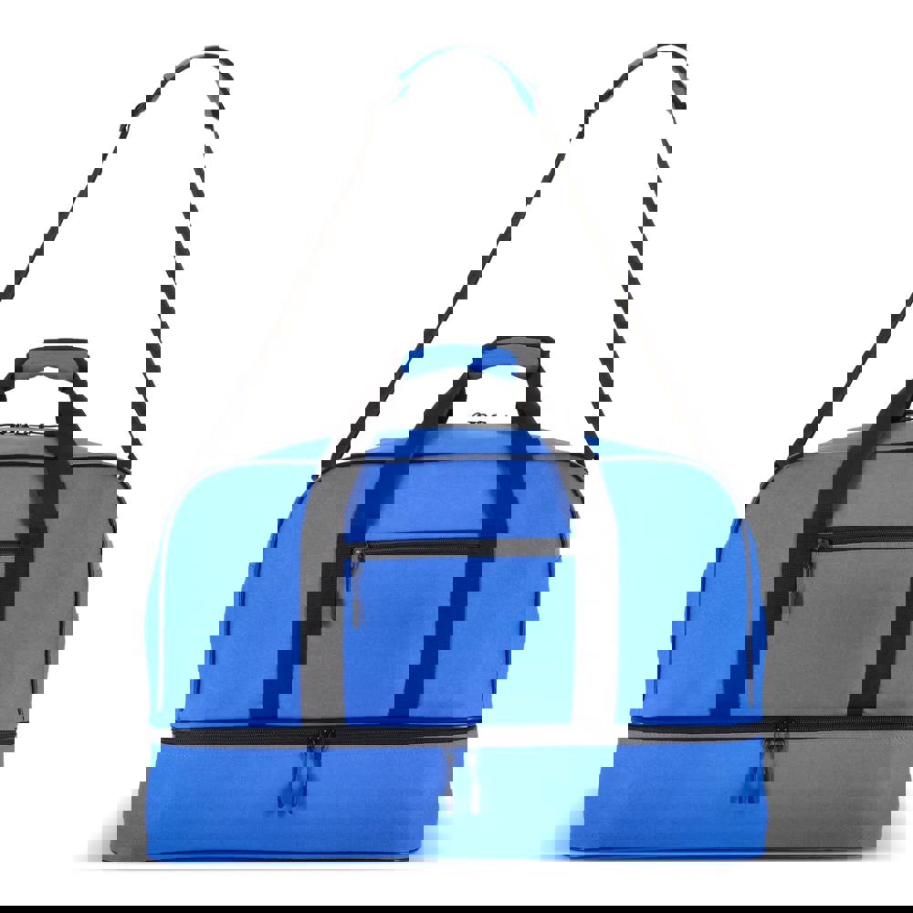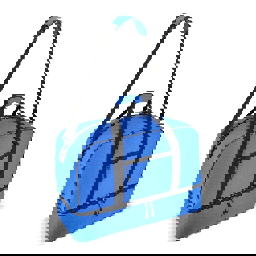 Reis- of sporttas met twee vakken, gemaakt van 600D gerecycled polyester. Voorzien van draaghandvatten, een afneembare en verstelbare schouderriem, een voorvak met ritssluiting en een bodemplaat voor stabiliteit. Twee vakken houden natte of vuile kleding en handdoeken gescheiden van andere spullen, of schoenen apart van kleding tijdens het reizen.