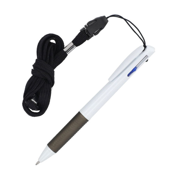 Driekleurige balpen met grip en keycord. De schrijfkleuren zijn blauw, zwart en rood.